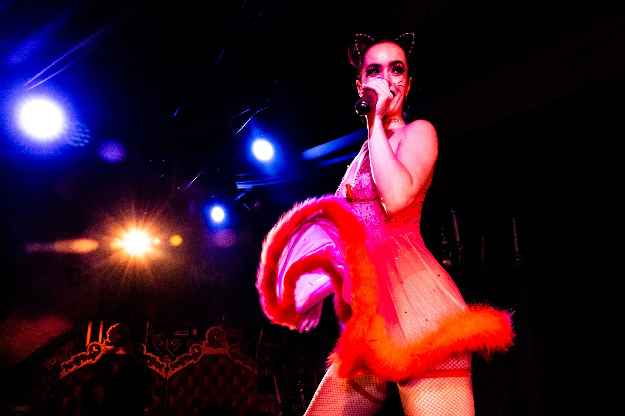 Nate Watters: This was one of the earlier shows I shot for Can Can, it’s Jennifer Milani in June of 2018. I love how she’s arched all the way back, looking at me straight down into the lens. In the old space, I would be able to sit in this booth in the back and I could lean over the railing and put my camera dead center of the catwalk. It was so fun when a performer would run up right in front of me, and I could get shots like these. I leaned over the catwalk right at the perfect moment for this one. I love how both of her feet are on that railing, with her right heel practically hanging off. Everyone’s amazed, protectively holding their drinks. Nate laughs.